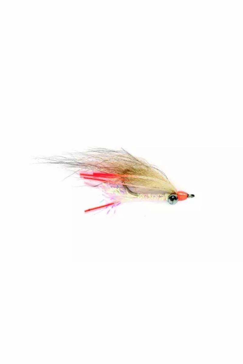 Litt kraftigere Bonefish mønster som er litt tyngre vektet. Naturfarget rev i vingen. En lys flue med gummibein med orange tipper gir en vel fiskende flue på flatsen. Krokstørrelse 4.