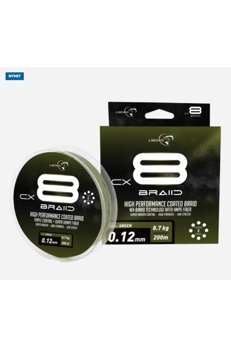 Lawson CX8 Braid er et råsterkt og glatt supersnøre, flettet av åtte HMPE-fibertråder, ved hjelp av WX-teknologi. Denne produksjonsmetoden forbedrer både styrken, fibertettheten og overflaten på snøret betydelig. Som en konsekvens av dette er Lawson CX8 tynt og ekstremt sterkt i frivann. Coatingen gjør det også mer motstandsdyktig for ytre påkjenninger, og ikke minst vannavstøtende. Snøret har også suveren knutestyrke. Lawson CX8 Braid er ensfarget grønn. Snøret både skjærer godt gjennom vannet og er tilnærmet lydløst gjennom stangringene. Passer perfekt både til kasting fra land og fisking fra båt.