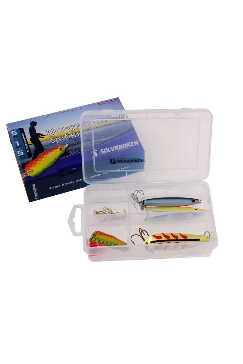 Norgespakken sjø er satt sammen av våre favorittsluker til sjøfiske. Her har vi valgt ut sluker som skal gi fiskeglede, og fiskegarantien fra Norgespakken ferskvann gjelder selvsagt her også. Settet består, foruten den solide slukboksen i plast, av følgende sluker: Jensen Sild (25 g), Jensen Pirken (25 g), Stingsilda® (28 g), Slukhals (25 g) og Salamander Allround (24 g). Løse snaphvirvler følger også med.