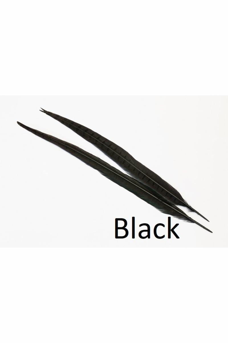 Fasanhale fjær i sort farge. Brukes hovedsakelig til ørret fluer. Det er 2 fjær i hver pose.