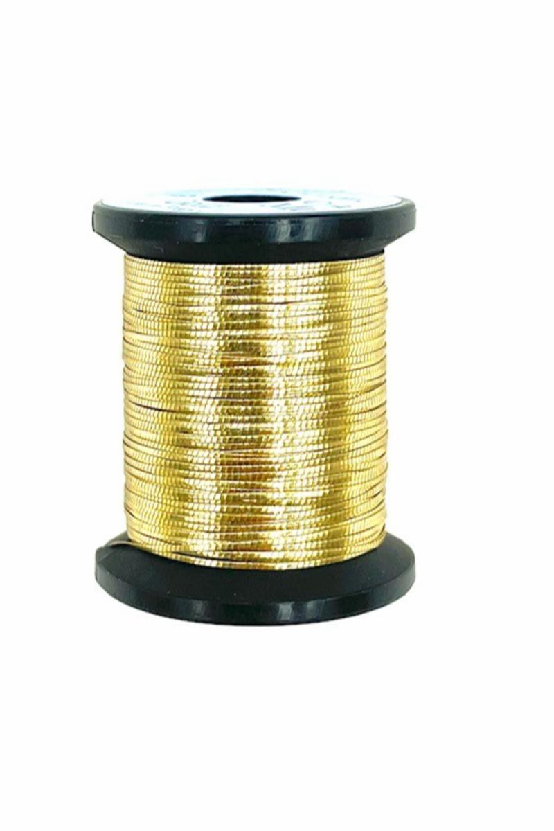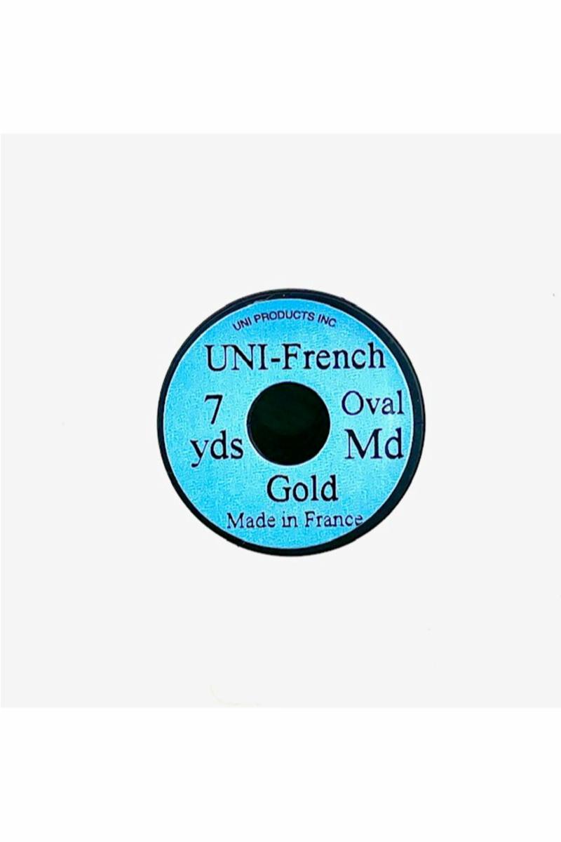 UNI French er høy kvalitets oval medium tinsel som brukes hovedsakelig som ribbing under fluebinding. Spole av 6 meter og gull farget