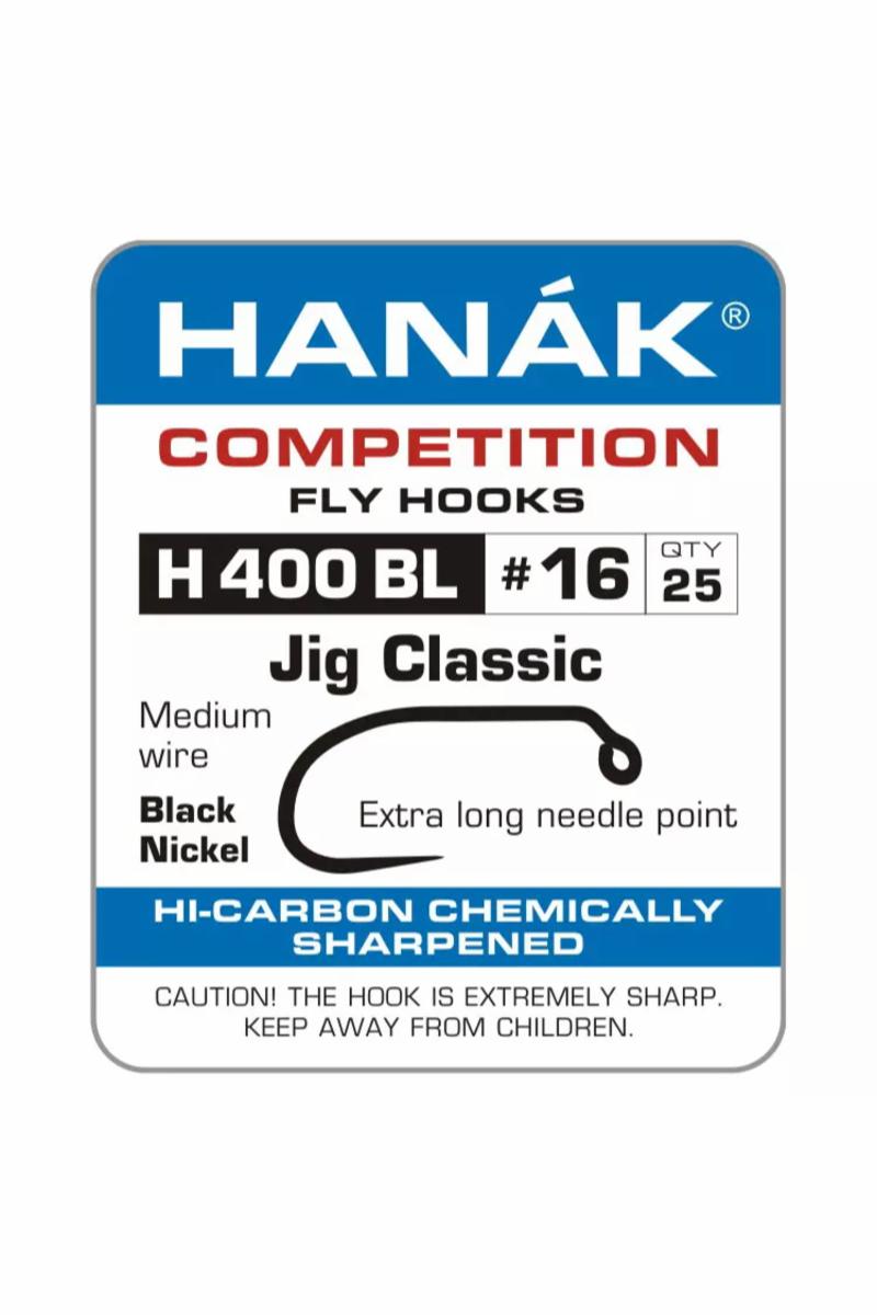 Hanak 400 BL Jig Classic er en referansekrok for andre jig kroker. Om du er usikker på hvilken jig krok du skal velge, er dette en trygg modell å lande på. H 400 BL er kroken Lance Egan hovedsakelig benytter på sine euro nymfer. -ekstra lang «stright needle point » -medium wire -black nickel -25 krok i pakken