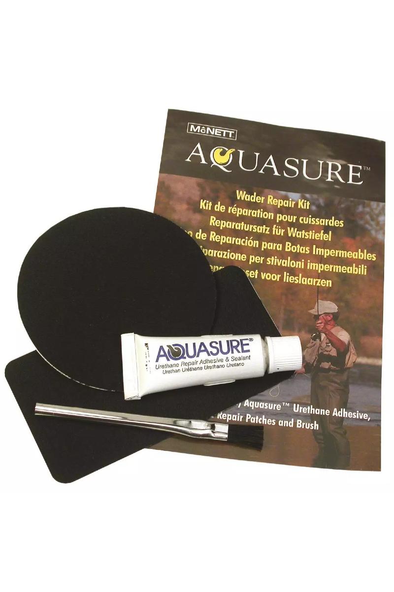 Rep-settet består av en 7 gram minitube med AquaSure, børste for pensling når man trenger et tynt limsjikt, og 2 lapper som kan tapes over selve reparasjonen, og eventuelt brukes på motsatt side (vadebukser) for å holde eventuelle rift og hull sammen. AQUASURE påvirkes verken av høy varme eller sterk kulde, heller ikke av vann eller kjemikalier. AQUASURE er et enkomponent limprodukt basert på uretangummi som herder ved luftens fuktighet. AQUASURE tåler utrolige påkjenninger og temperaturer opp til 200°C og ned til -50°C når limet er herdet.