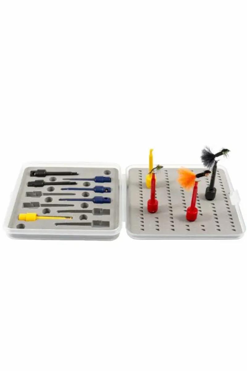 Dette fluebinder-displaysettet er det ideelle tilbehøret for den seriøse fluebinderen. Det består av en dobbeltsidig, gjennomsiktig boks i ABS-plast med skuminnlegg på begge sider. Den ene siden har spalteskum med plass til opptil 115 fluer, mens den andre siden holder 10 fargekodede krok- og hackletenger. Det er runde hull på begge sider, der hackletengene sitter, noe som gjør dette til det perfekte settet for tørking og fremvisning av fluer.