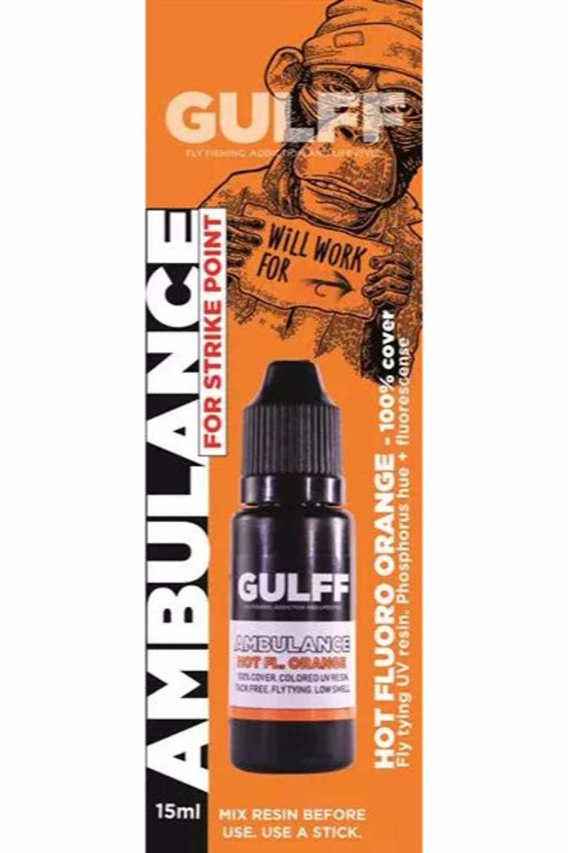 Gulff Ambulance UV lim har skarpe fine fluo farger som triggerpunkt på fluer. Stort bruksområde fra saltvann til laksefluer. Mye brukt innerst på treblekroken på laksetuber, så får du ett triggerpunkt, samt at vingen ikke vikler seg til treblekroken. Gulff Ambulance er klebefri og fungerer godt sammen med Loon UV lykter. Bruk tynne lag. Med en god UV lampe er limet tørt etter 10 sekunder. Bør ristes eller røres i før bruk.