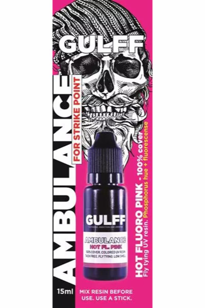 Gulff Ambulance UV lim har skarpe fine fluo farger som triggerpunkt på fluer. Stort bruksområde fra saltvann til laksefluer. Mye brukt innerst på treblekroken på laksetuber, så får du ett triggerpunkt, samt at vingen ikke vikler seg til treblekroken. Gulff Ambulance er klebefri og fungerer godt sammen med Loon UV lykter. Bruk tynne lag. Med en god UV lampe er limet tørt etter 10 sekunder. Bør ristes eller røres i før bruk.