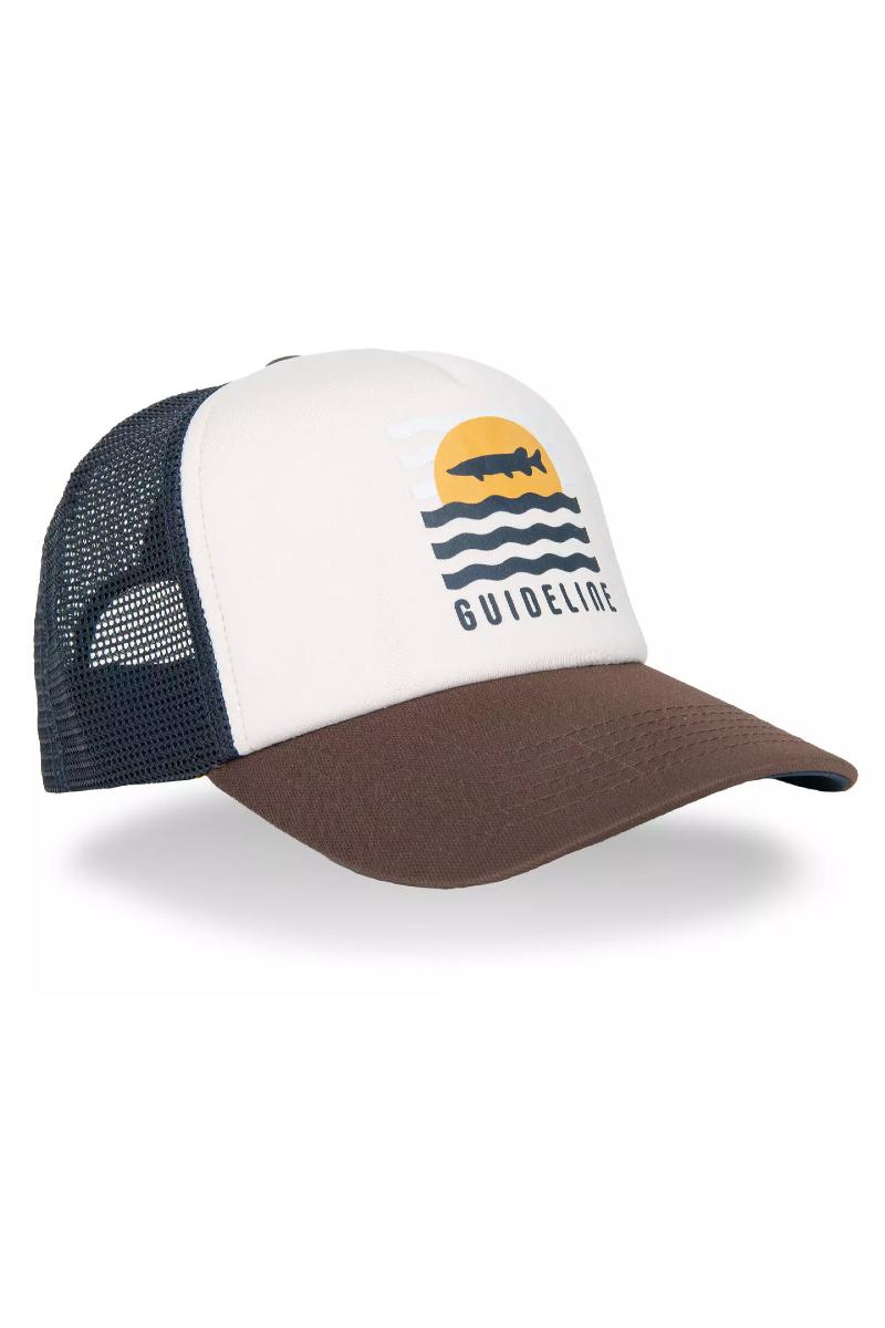 Guideline Predator Trucker Cap. Høyprofil trucker caps med foam materiale i fronten og luftige mesh paneler på siden og bak. Dryzone svettebåndsteknologi som effektivt leder fuktighet vekk og reduserer misfarging av capsen. Meshpanelene er i fargen coastal blue og fronten er off-white. Snakelogo bak og predatorfiskemotiv med Gjedde i fronten.