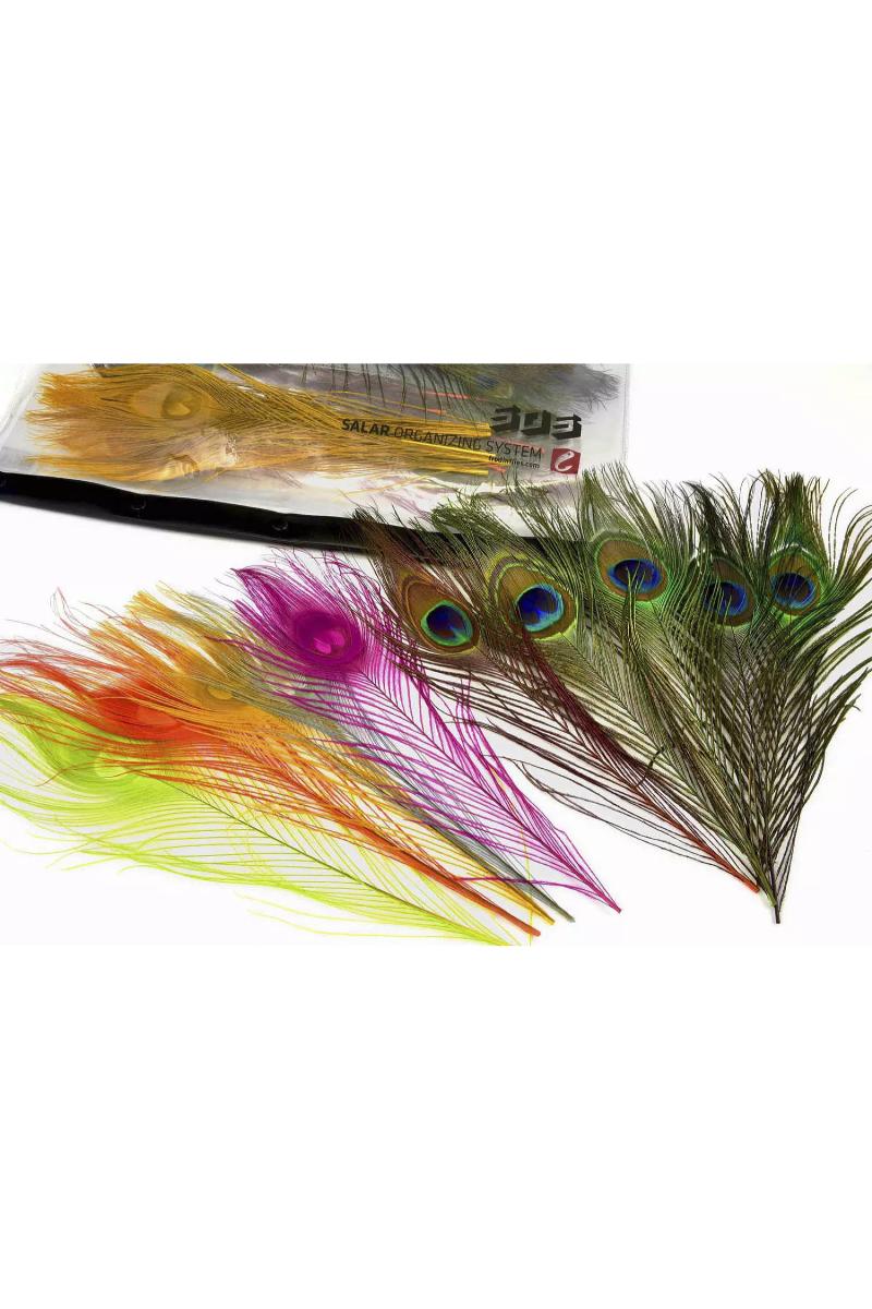 Frödin Peacock Feather Pack er en pakke med påfuglfjær i ti forskjellige varianter fordelt på 5 farger. Alle fem farger har både vanlig farget variant, og bleket/farget variant. Leveres i Frödin Salar Organizing System Large.