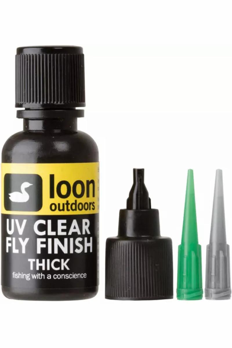 UV lim har tatt over for epoxy til fluebinding i de aller fleste tilfeller. Ryddig og rent å jobbe med og ikke noe form for søl, da du trykker limet rett ut fra flasken. Bruk lakknål om nødvendig til å få forme limet på flua. Lys med Loon UV lampen og det er tørt på ca. 15 sekunder. Bruk gjerne klar lakk som topp lag (coating) etterpå for å få bort det lille "henget" du kjenner når du tar på det. Innhold pr. flaske er 14ml. Thick er den tykke utgaven som passer til for eksempel Jiggy hoder, feste av øyne til fiskeimitasjoner og lignende. Thin er noe tynnere enn thick. Fin på rekeskjold, buzzers og lignende der du bare vil ha ett tynt lag lim. Flow er enda tynnere enn thin. Fin til fluer der du vil ha det tynneste lag lim.