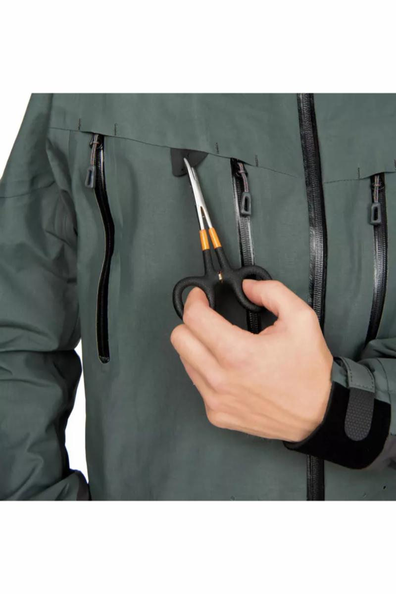Guideline Alta NGx Sonic Jacket er en perfekte skalljakke for den dedikerte sportsfiskeren som krever klassens beste vanntetthet og pusteevne. Jakken har smarte løsninger og en perfekt passform med artikulerte skuldre og albuer, som gir best mulig bevegelsesfrihet når du fisker med flue. Den høye fleece forete kragen, YKK Aquaguard®-glidelås og DuoDrag™ Sleeve Closure System holder deg varm og tørr under de tøffeste værforholdene. Jakken har festepunkter for tenger og verktøy. To store brystlommer gir god plass til fluebokser og som til og med har små innvendige lommer til fortommer m.m. Alta NGx-serien er designet for å tilby det høyeste nivået av holdbarhet og komfort i vår produktsortiment.Jakken er konstruert med en kombinasjon av sydde og sveisede sømmer. Stoffet og membranen har Guidelines høyeste nivå av vanntetthet og svært gode pusteegenskaper, men den forblir allikevel myk og behagelig å ha på. Passformen er generøs på de riktige stedene, slik at du kan ha flere lag med isolerende tøy under. Fasongsydde armer og skuldre gir deg optimal bevegelsesfrihet og gjør at ermene holder seg på plass når du strekker de frem. Hetten har avstivet i brem i framkanten og har 3-veis justering for best mulig passform.En høy krage foret med fleece gir god beskyttelse mot kulde og sur vind. Glidelåsen i front er av typen YKK Aquaguard® som er vannavvisende. Den har innvendig stormklaff med kanal for å la evt. fuktighet som kommer gjennom renne ned og på utsiden av jakken. To høyt plasserte brystlommer har rikelig plass til store fluebokser med innerlommer for organisering av småsaker og fortommer m.m. Håndvarmerlommer foret med fleece kommer godt med når hendene trenger litt varme. Disse lommene er i likhet med de andre utstyr med YKK Aquaguard® glidelåser som gjør at de også egner seg til oppbevaring av det du møtte ønske.Guideline Alta NGx Sonic Jacket har doble (Hypalon) dokkingstasjoner i fronten der du enkelt fester peang og fortomsklipper. Nederkanten på jakken har dobbel justering og en drenering i mesh for å unngå oppsamling av vann når du vader. På innsiden er det to lommer, en i stretchmateriale og en med Aquaguard® glidelås. Guideline DuoDrag™ Sleeve Closure System kan strammes for å hindre at vann kommer inn i armen og laget i neopren for å holde deg varm under lange fiskeøkter. En D-ringen i nakken holder håven lett tilgjengelig uten å være i veien. https://youtu.be/tgOg8egBcKI| Farge | Algae green/Graphite |