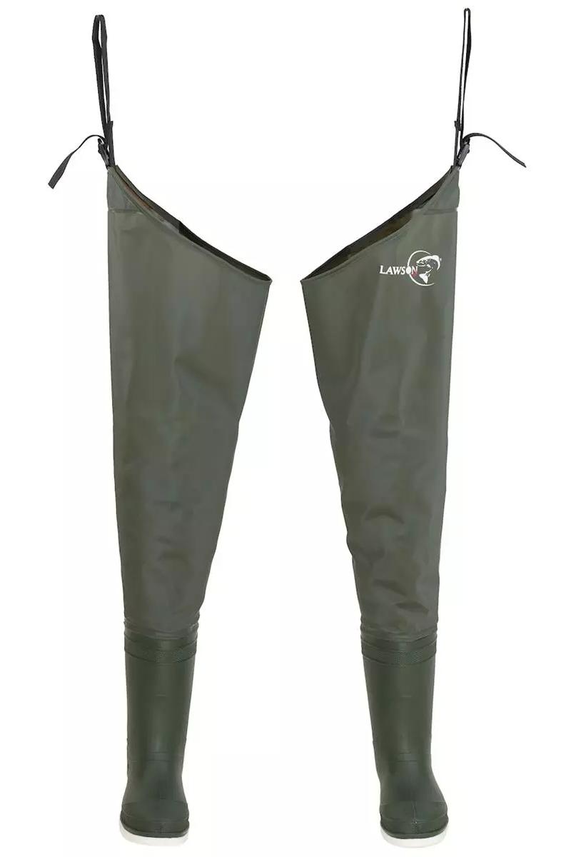 Lårhøye vadestøvler i PVC-materiale med hemper til belte–feste og filtsåle.