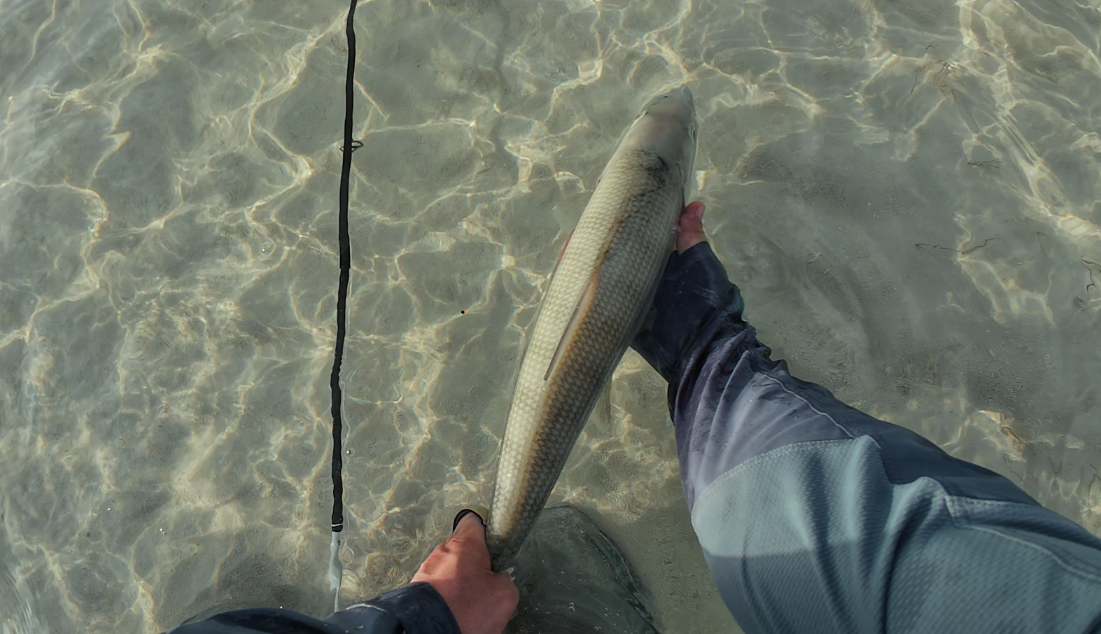 Etter en tidlig kveld var vi endelig i gang. Milelange flats, lite vind og sol. Vi fant mye fisk, og etter et par mistede fisk lykkes EB. I vakker solnedgang subber jeg meg inn mot land, ganske utslitt. I øyekroken ser jeg en fisk som tar en vending. Jeg druser ut et kort kast uten reaksjon. Et langt kast til høyre gir øyeblikkelig svar: 50 meters utras i Usain Bolt-fart mens jeg hyler som en liten drittunge. Dette gikk jo på skinner. Kunne «The Grey Ghost» være så lett å lure?
